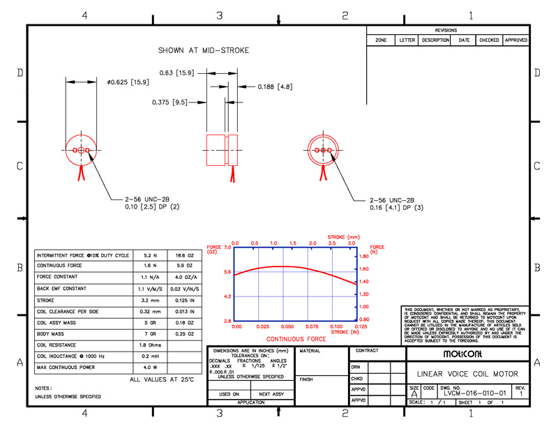 Linear Voice Coil Motor Actuator LVCM-016-010-01VAC, Vacuum Compatible, Continuous Force: 5.9 Oz (1.6 N), Stroke: 0.125 in (3.2 mm)