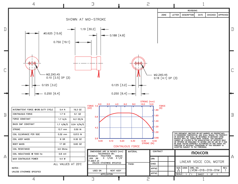 They are only 30.2 mm (1.19 in) long at mid-stroke. The LVCM-016-019-01MVAC (Metric) Linear Voice Coil Motor has M2.2X0.45 threaded mounting holes on a 6.4 mm (0.250 in.) bolt circle on the housing and the coil ends, and the LVCM-016-019-01VAC has 2-56 UNC-2B threaded holes for easy integration of these linear servo motors into a new or existing application. |