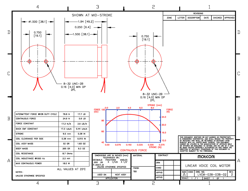 Linear Voice Coil Motor Actuator LVCM-038-038-02VAC, Vacuum Compatible, Continuous Force: 5.6 lb (24.9 N), Stroke: 0.38 in (9.5 mm)