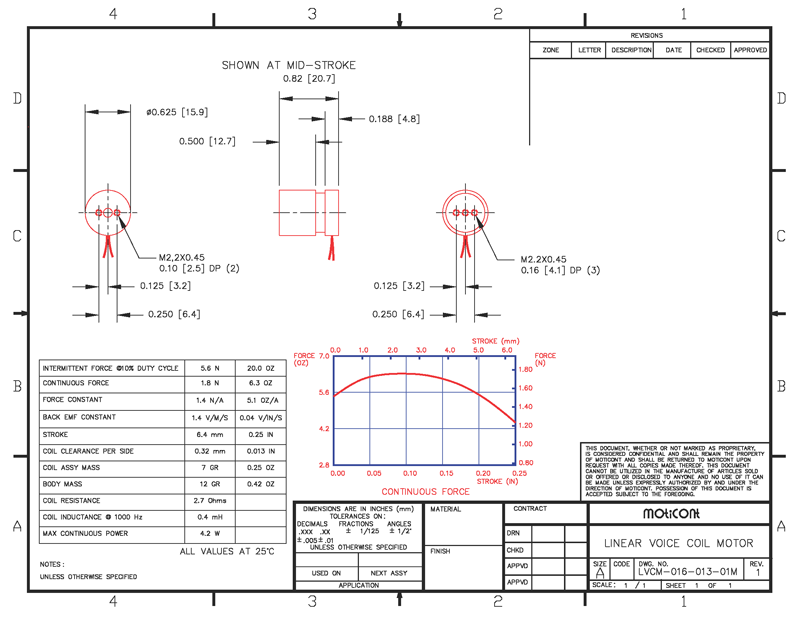 Linear Voice Coil Motor Actuator LVCM-016-013-01VAC, Vacuum Compatible, Continuous Force: 6.3 Oz (1.8 N), Stroke: 0.25 in (6.4 mm)