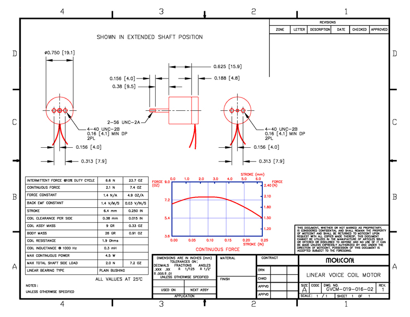 the housing. This linear actuator features high acceleration/deceleration, high speed, high reliability, and zero backlash. Clean and quiet, this brushless servo linear actuator’s 0.094 in. (2.38 mm) diameter shaft has a 2-56-UNC-2A thread to a length of 0.156 in. (4.0 mm) for a backlash free connections and the housing and coil ends each have 2 4-40 UNC-2B threaded mounting holes on 0.313 in (7.9 mm) centers. The built in centered shaft facilitates the commissioning of the motor for easy integration into current and future applications. |