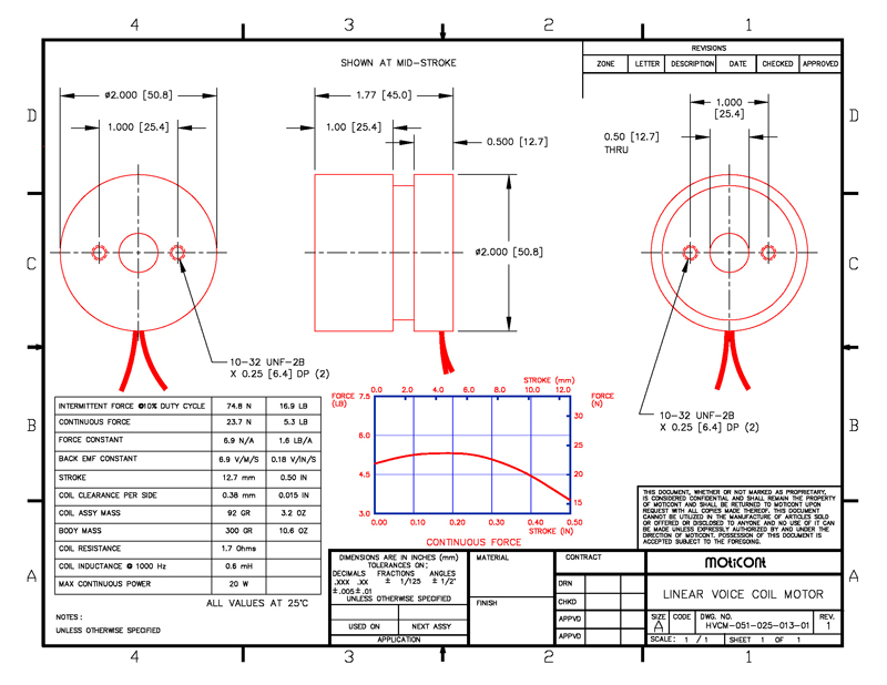 cogging, zero backlash. The HVCM-051-025-013-01VAC Linear actuator has a hollow core that allows for optics, illumination, laser beams, or cables to pass through. Additionally, it has a continuous force rating of 5.3 lbs (23.7 N) and a peak force of 16.9 lbs (74.8 N) at a 10% duty cycle. This compact voice coil actuator measuring just 2.000 in. (50.8 mm) dia. by 1.00 in. (25.4 mm) housing length with a 0.50 in. (12.7 mm) stroke. Two 10-32 UNF-2B x 0.25 in. (6.4 mm) deep threaded mounting holes on 1.000 in. (25.4 mm) centers in the housing and coil allows for flexible and easy integration into new and existing applications. |