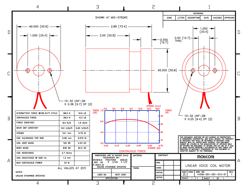 | Model # | Stroke | Continuous Force | Intermittent Force @ 10% Duty Cycle | Housing Length | Through Hole Dia. | |||||