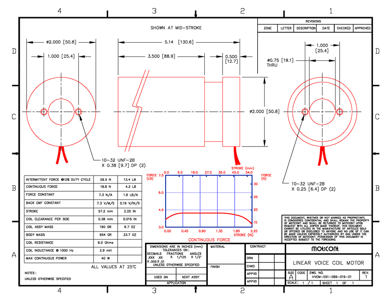 has zero backlash when connected directly to a load. It features a 2.250 in. (57.2 mm) stroke, the 0.75 in. (19.1 mm) open aperture and smooth motion. The HVCM-051-089-019-01VAC DC Voice Coil Servo Motor has a body diameter of 2.000 in. (50.8 mm) and the housing is 3.500 in. (88.9 mm) long and is 5.14 in. (130.6 mm) long at mid-stroke. All linear servo motors in the HVCM series of open aperture brushless servo motors are extremely quiet, clean room compliant, and capable of high precision when used in closed loop applications. Two 10-32 UNF-2B x 0.38 in deep. threaded mounting holes on 1.000 in. (25.4 mm) centers in the housing and coil allow for flexible and easy integration into new and existing applications. When used in closed loop applications with an adequate position sensor, resolutions of less then 1 micron are achievable. |