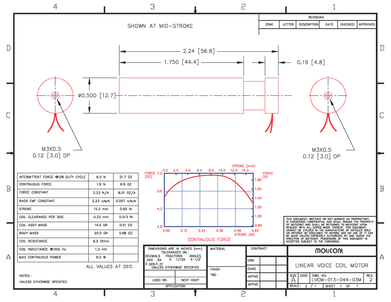 Linear Voice Coil Motor Actuator LVCM-013-044-03VAC, Vacuum Compatible, Continuous Force: 6.9 Oz (1.9 N), Stroke: 0.60 in (15.2 mm)