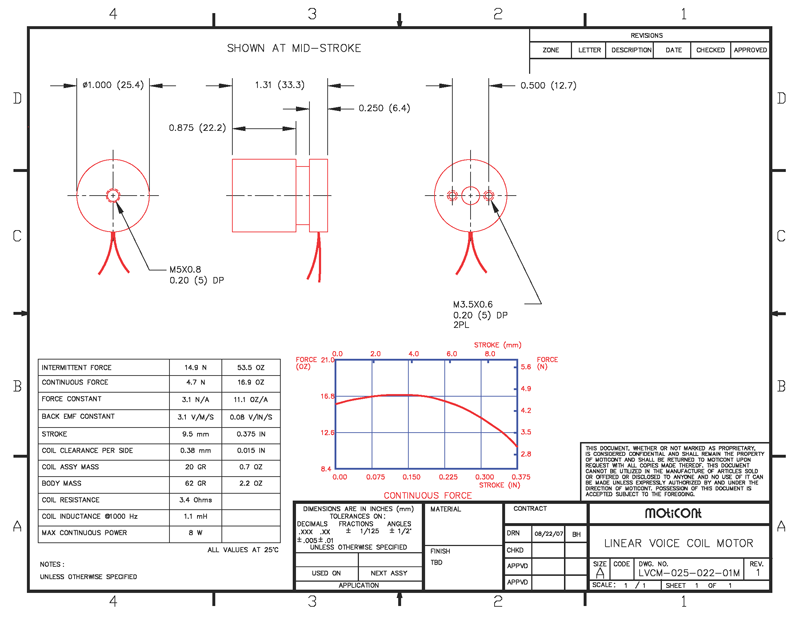 Linear Voice Coil Motor Actuator LVCM-025-022-01VAC, Vacuum Compatible, Continuous Force: 16.9 Oz (4.7 N), Stroke: 0.38 in (9.5 mm)