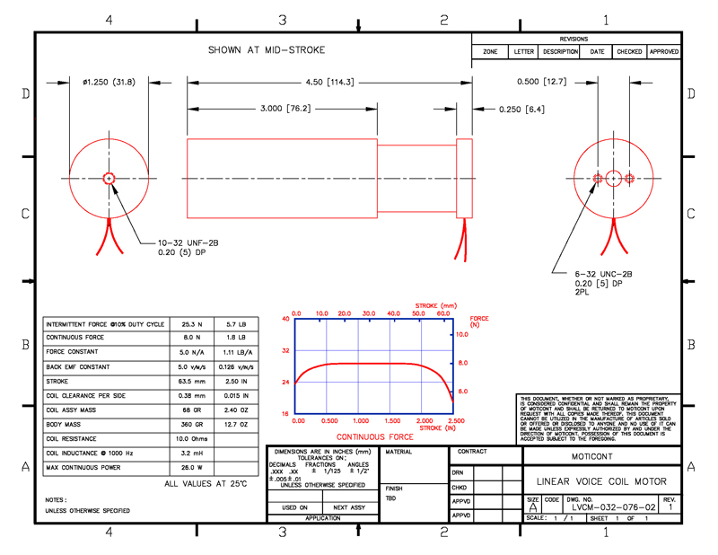 Linear Voice Coil Motor Actuator LVCM-032-076-02VAC, Vacuum Compatible, Continuous Force: 1.8 lb (8.0 N), Stroke: 2.50 in (63.5 mm)
