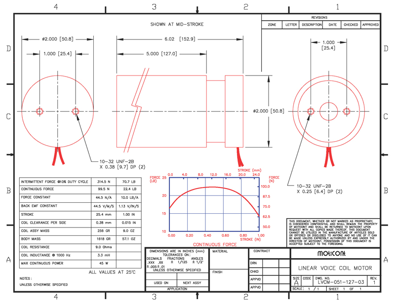 Linear Voice Coil Motor Actuator LVCM-051-127-03VAC, Vacuum Compatible, Continuous Force: 22.4 lb (99.5 N), Stroke: 1.00 in (25.4 mm)