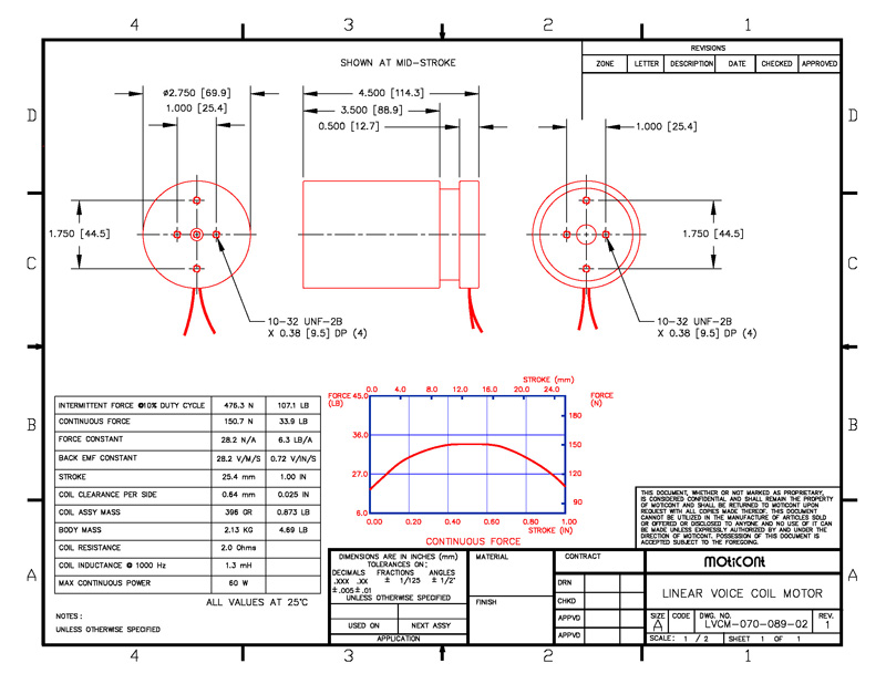 Linear Voice Coil Motor Actuator LVCM-070-089-02VAC, Vacuum Compatible, Continuous Force: 33.9 lb (150.8 N), Stroke: 1.00 in (25.4 mm)