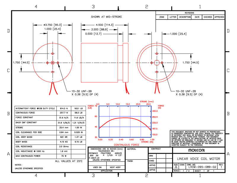 Linear Voice Coil Motor Actuator LVCM-095-089-02VAC, Vacuum Compatible, Continuous Force: 58.0 lb (257.7 N), Stroke: 1.00 in (25.4 mm)